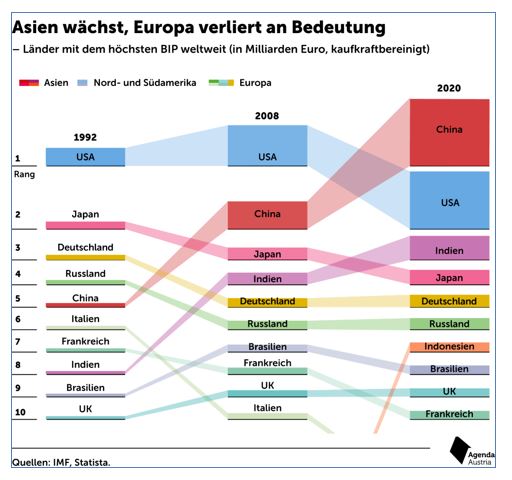 Die Dramatik dieser Entwicklung wird vielleicht noch deutlicher, wenn man bedenkt, dass noch im Jahr 2000 das chinesische Sozialprodukt gerade einmal das Italiens erreicht hat. Die beiden anderen hier dargestellten Regionen reagieren jedenfalls völlig unterschiedlich auf diese Gewichtsverlagerung: Die USA unter Trump reagieren mit einem Versuch des Blockierens chinesischer Produkte und Technologien, und Europa bleibt, ausgenommen die Verhinderung einzelner Firmenübernahmen, passiv und unentschlossen. Die Strategie Trumps beschränkt sich nur nicht auf die Abwehr des relativen Bedeutungsverlustes gegenüber China. Unter dem Titel „America First“ lässt er ehemalige Verbündete wie etwa die syrischen Kurden im Stich, verärgert die europäischen Verbündeten und blockiert die Nominierung von Schiedsrichtern bei der WTO, die sich zumindest als Instrument der Streitschlichtung immer wieder als nützlich erwiesen hat.