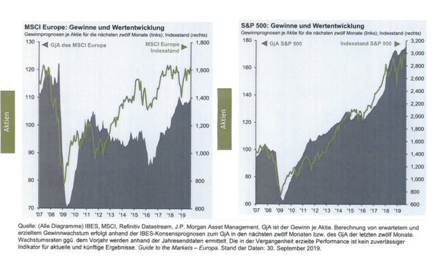 Man beachte zunächst, dass die Werte auf der vertikalen Achsen der beiden Graphiken nicht ident sind. Wären sie das, dann müsste die Graphik auf der rechten Seite, die die Entwicklung in den USA zeigt, doppelt so hoch sein wie die auf der linken. Wesentlich aber ist, dass in den USA der Zusammenhang zwischen der Entwicklung der Gewinne der Unternehmen und der Entwicklung der Aktienkurse langfristig sehr eng ist. Auch der Absturz 2009 ging bei Gewinnen und Kursen ziemlich synchron vor sich. Dieser Zusammenhang kann gelegentlich kurzfristig durch Panik-ausbrüche an den Börsen unterbrochen werden, sei es weil wie etwa 1929 die Finanzierung von Aktienkäufen unter Inanspruchnahme viel zu hoher Risken erfolgt ist, oder aber, weil Spekulation-sblasen wie etwa 2008 im Hypothekarbereich platzen. Am langfristigen engen Zusammenhang zwischen Gewinnen einerseits und Aktienkursen andererseits hat das nichts geändert.