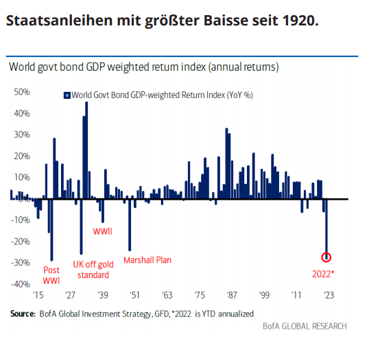 Das erste Halbjahr 2022 war, gemessen am Kursverfall in New York, das schlimmste seit der großen Depression1932, also seit 90 Jahren. Der Weltaktien-index MSCI World ist um gut 20 % gefallen, Technologieaktien um die 30 %, und amerikanische Anleihen um 14 %. Für die war es das ärgste Jahr seit 1788, seit über 200 Jahren.